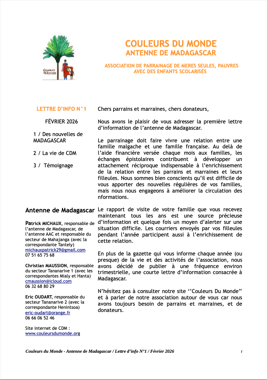 « Tous les Évènements Cet évènement est passé La lettre d’information de l’antenne de Madagascar 15 février Navigation Évènement « Mission prévue à Madagascar en mars 2026 Cliquer ici pour consulter la lettre d’information. + Google Agenda+ Exporter vers iCal Détails Date : 15 février